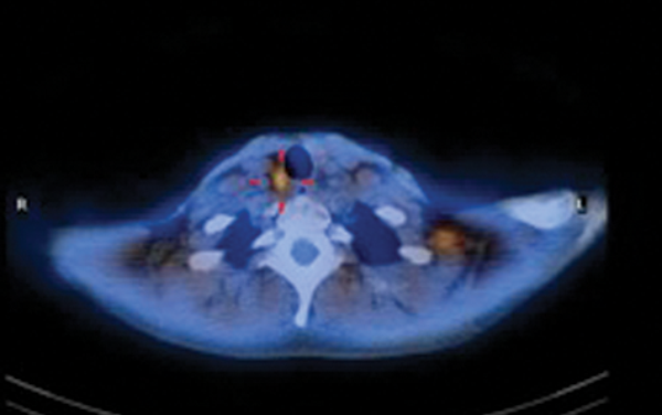 Figure 4: Fused 99mTc-sestamibi SPECT / CT image localises abnormal tracer uptake