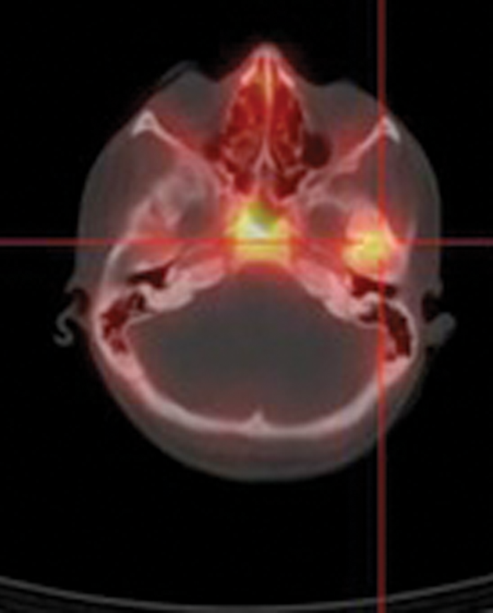 To date, no imaging modality provides a ‘gold standard’ for diagnosis and follow-up of SBO. CT allows good assessment of bone erosion and extracranial spread, both features of advanced disease; MRI offers good soft tissue evaluation including meningeal involvement and spread into medullary bone spaces [4]. However, neither of these modalities is particularly helpful in monitoring or follow-up due to persistence of anatomical alterations despite resolution of disease. Nuclear medicine techniques such as bone scintigraphy, indium-labelled white blood cell scans and gallium scans have traditionally been the mainstay of diagnosis and follow-up of patients with SBO. Scintigraphic bone scanning with technetium-99m methylene diphosphonate (99mTc-MDP) has high sensitivity for demonstrating increased osteoblastic activity and allows earlier diagnosis of osteomyelitis than CT imaging [5]. Bone scintigraphy remains positive for months even if there is no active infection and is therefore not useful in long-term monitoring of the condition. Indium and gallium-labelled radiopharmaceuticals accumulate in areas of active infection and can therefore be used for follow-up and prediction of resolution (Figure 1).