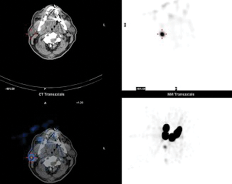 Figure 2: Axial CT (top right). Fused SPECT / CT (bottom right) and lymphoscintigraphy (left)