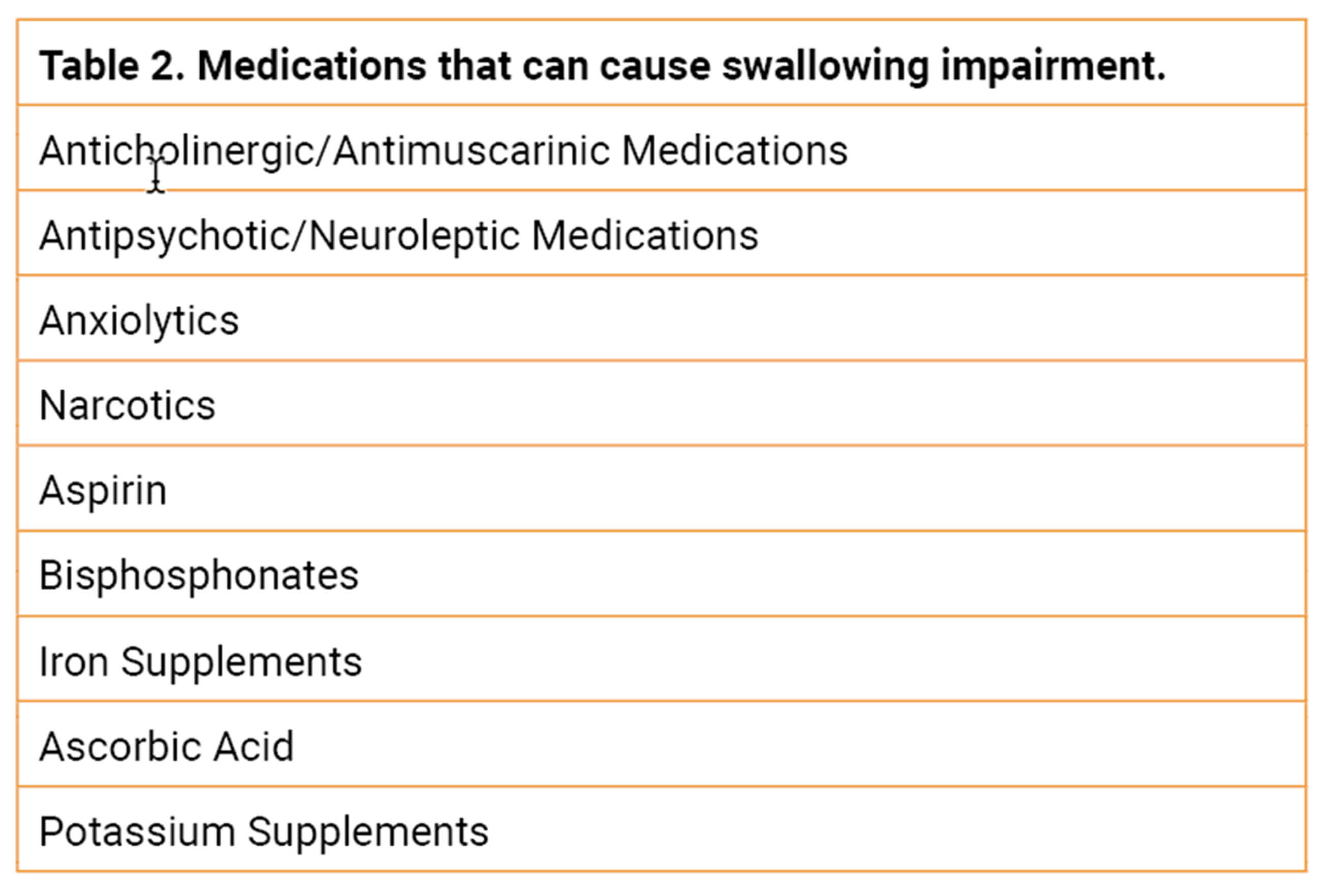 Up to 40% of Americans report difficulty swallowing pills. The most common sites of pill retention among the elderly in decreasing prevalence are the vallecula, upper oesophageal sphincter, the aortic arch, and the lower oesophageal sphincter. Alterations in orofacial and lingual muscle tone and diminished upper ooesophageal sphincter opening, as described previously, are the primary forces contributing to this difficulty. Calcification of the aorta, oesophageal stricture and neoplasm, and oesophagogastric outlet obstruction are secondary causes. The size, shape, and texture of pills and tablets all influence ease of consumption. In addition to the physical difficulty elderly people can experience swallowing pills and tablets, the systemic and caustic effects of certain medications and may cause dysphagia and swallowing impairment. Table 2 depicts the most common medications that can cause dysphagia in the elderly.