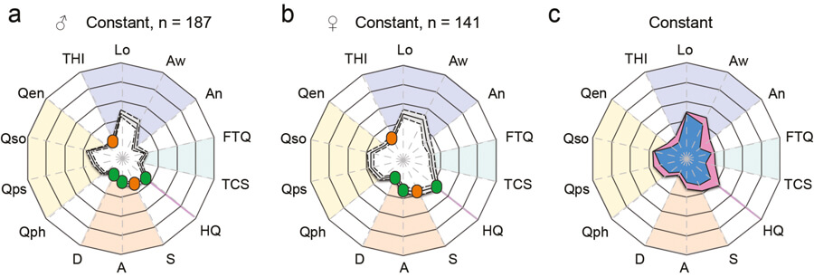 Figure 1. Radar chart profiling for characterising global health burden in individuals with constant tinnitus. Radar charts illustrating the evaluation of global changes in tinnitus burden according to constant tinnitus for men (a) and women (b). In these charts, a solid line shows the average, with the 95% confidence intervals represented by the dashed lines. Average tinnitus-associated burden, for men (blue) and women (pink) is shown for constant (c) tinnitus. Instruments are labelled as follows: THI: tinnitus-related psychological distress; Lo: Tinnitus loudness; Aw: Tinnitus awareness; An: Tinnitus annoyance; TCS: Tinnitus catastrophising; FTQ: Tinnitus fears; HQ: hyperacusis questionnaire; S: Stress; A: Anxiety; D: Depression scores; Quality of Life for physical (Qph), psychological (Qps), social (Qso), and environment (Qen). Colour dots illustrate the severity score of those instruments with published severity category boundaries: negligible (green), moderate (orange), severe (red). Image adapted from Schlee et al [2].