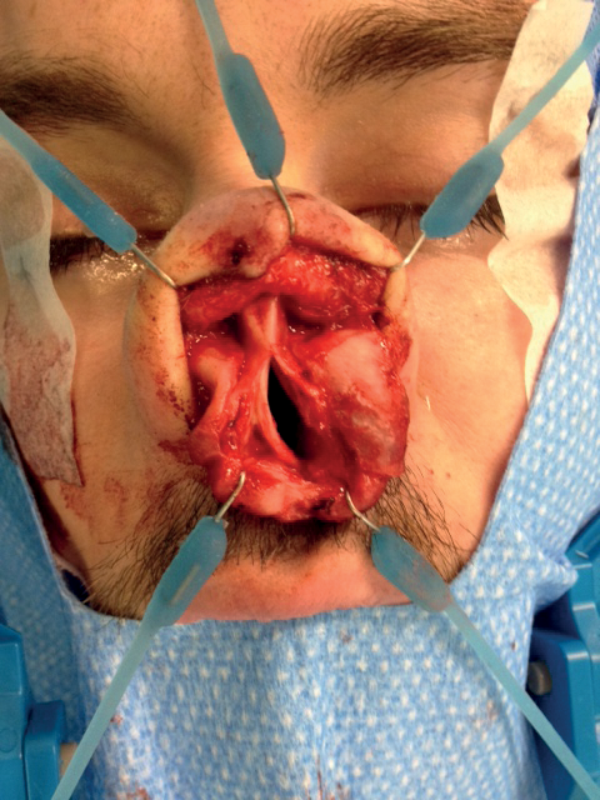 Inverted ‘V’ incision is placed over the columella as in classical open septorhinoplasty procedure. Bilateral marginal incisions are placed along the caudal edges of the lower lateral cartilages and dissection is continued medially down the length of the columella. The columellar skin is elevated off the medial crura and skin dissection is continued dorsally in the supraperichondrial avascular plane until the nasal bones are reached, where the periosteum is elevated using a periosteal elevator.