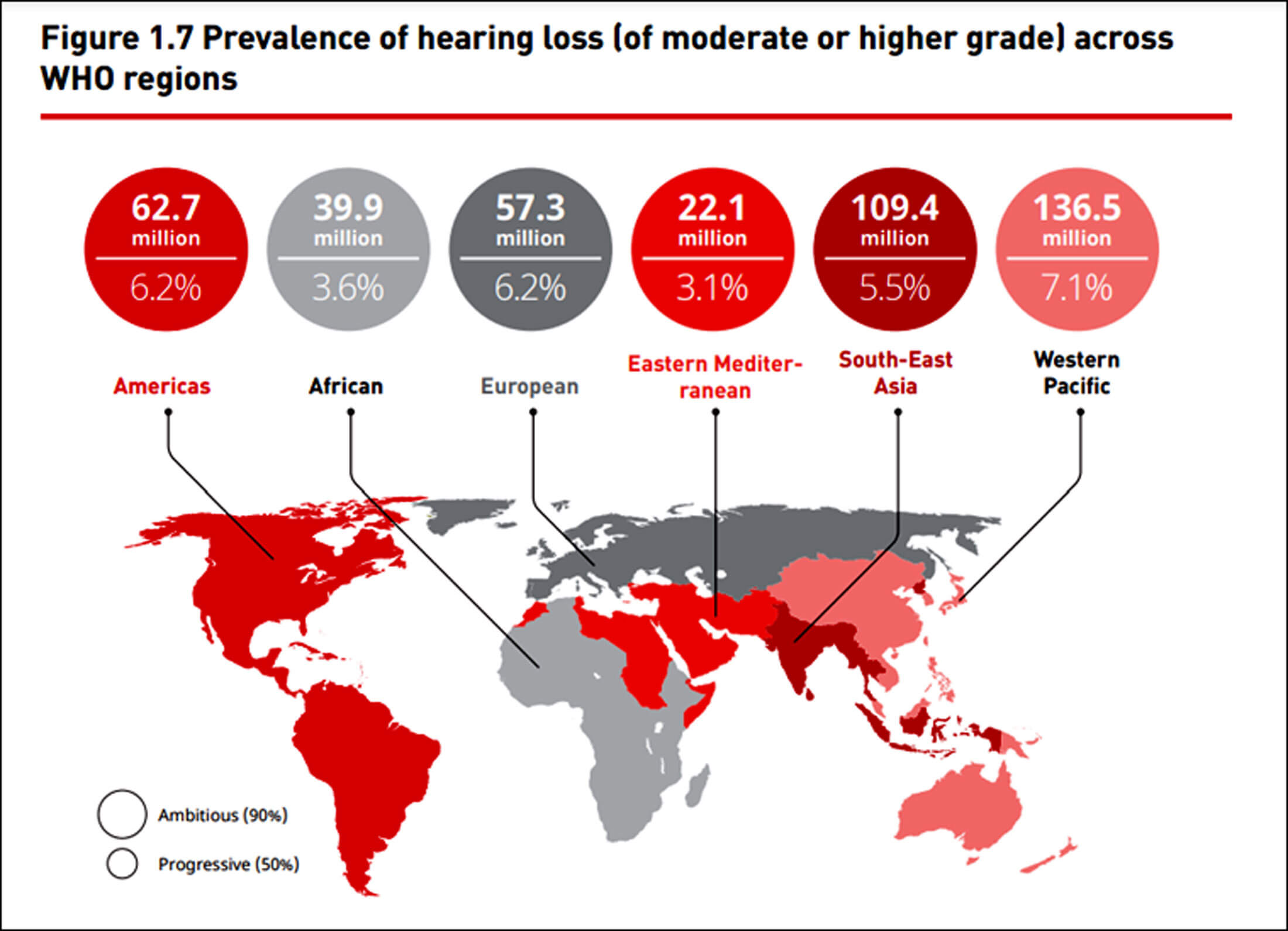 Prevalance of hearing loss (of moderate or higher grade) across WHO regions [6].