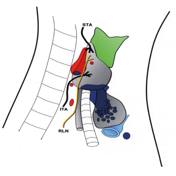 Figure 2. ITA: Inferior Thyroid Artery. STA: Superior thyroid artery. RLN: Recurrent laryngeal nerve
