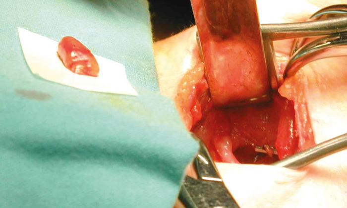 Figure 3 (left). Normal Parathyroids - as shown by the two dissecting forceps. Note the lymph node dorsal to the superior parathyroid which has a more granular appearance than the parathyroids.
