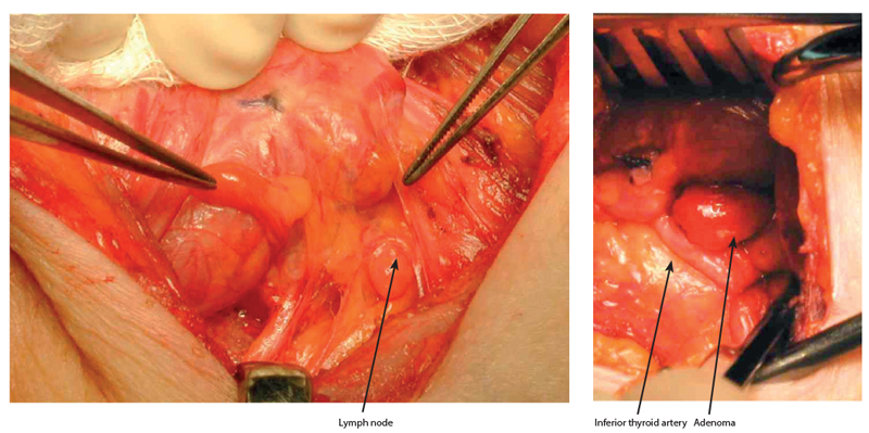 - Carefully inspect the capsule of the thyroid inferiorly - sometimes the adenoma can be hidden just under the capsule of the thyroid (almost ‘intra-thyroidal’).