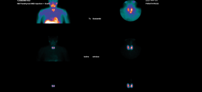 Figure 1: Dual isotope sestamibi scan showing evidence of a left inferior parathyroid adenoma.