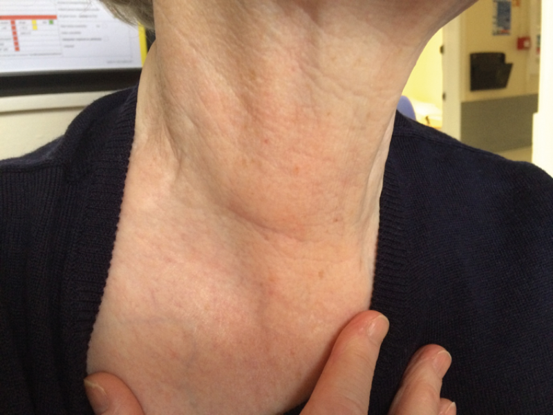 Once the diagnosis is confirmed, preoperative localising studies can help to target the potential parathyroid adenoma. A dual isotope 123 iodine / 99mTc sestamibi scan helps to localise the parathyroid adenoma - if this is positive (see Figure 1) a parathyroid USS can be performed and, if both scans are concordant with the location of the abnormal gland, a targeted approach can be made by a unilateral neck exploration (UNE) or focused single gland approach. A USS is useful also if there is a palpable thyroid nodule so that this can be assessed preoperatively (with fine needle aspiration if required). If imaging fails to localise preoperatively and I think that the neck exploration is going to be awkward (short stout neck), or if the patient has autoimmune thyroiditis (can be difficult with surrounding lymph nodes and atrophic thyroid), I may consider a preoperative 4D CT scan to aid localisation. Patients with non-localised imaging will require a bilateral neck exploration (BNE).