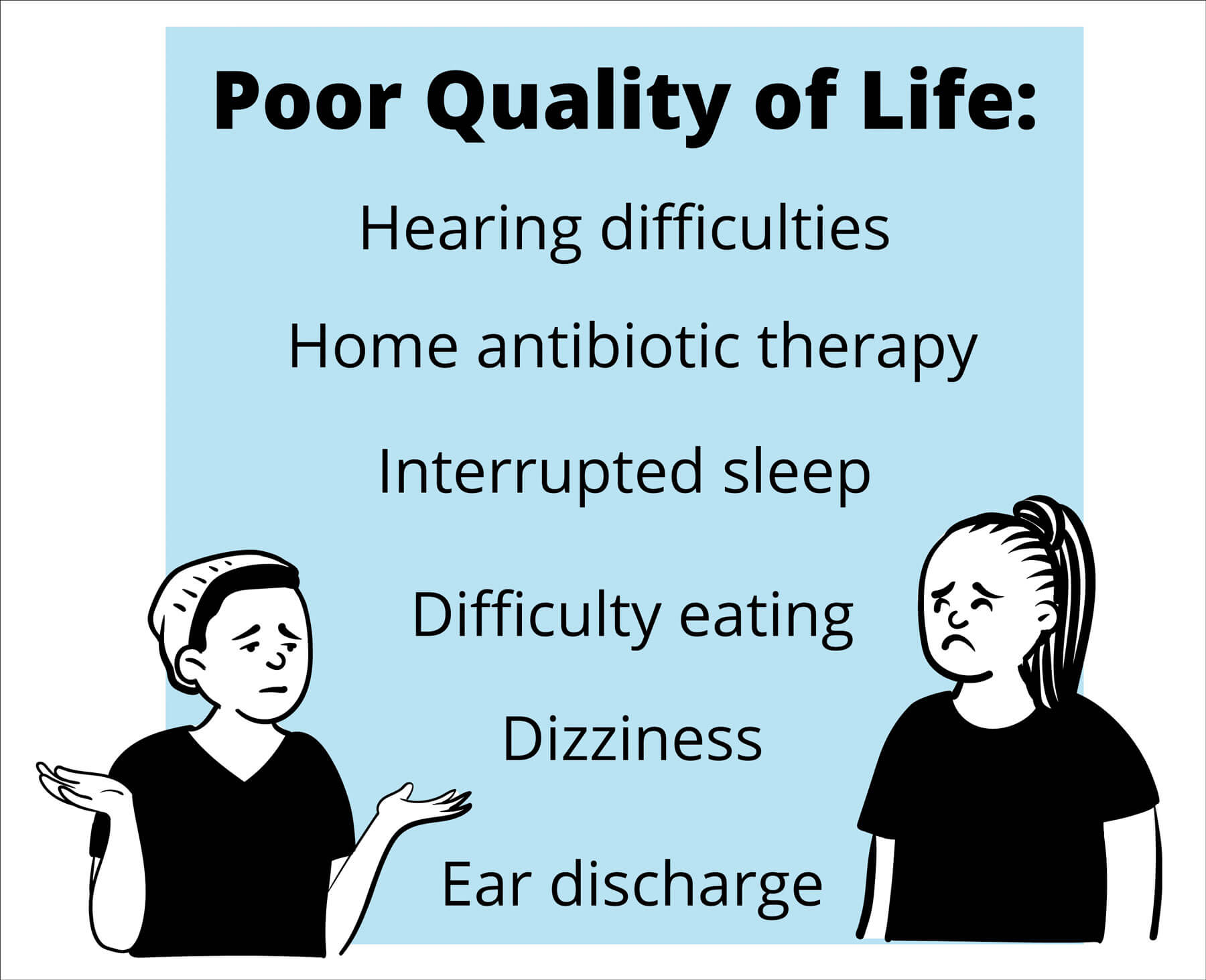 Patients have a poor quality of life whilst suffering with NOE. Both pain and decline in mental health contribute to a deterioration in quality of life for the patient, but there are also other responsible factors which are shown in Figure 2. NOE is debilitating for patients; it causes hearing difficulties, weight loss (due to the pain caused by eating, they are unable to eat), ear discharge, dizziness, hearing difficulties and disrupted sleep. We must be aware that NOE is more than just an ear infection, and we should appreciate the entire impact it has on the patient. Furthermore, NOE can disrupt relationships with family and friends.