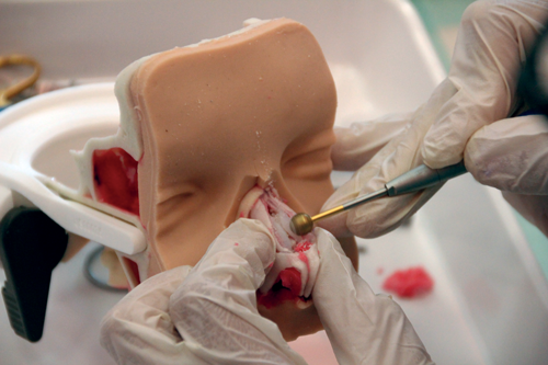 There is no way to train for this besides on our artificial temporal bones. Also, for FESS surgery, our models are a great supplement or alternative for working on human specimens. With the PHACON Trainers the doctors have the chance to work on realistic anatomical models of a bone like material combined with various soft tissues. They can use their common devices and instruments and with the navigation camera and software they can navigate within the included CT data set of the related model. Inside the software you can later evaluate your training. These features create a comprehensive training environment independent from location. No wet lab is needed and you can train in almost any location.