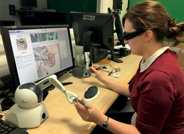 Simulators for temporal bone dissection are available as computer-based programmes which use 3D-imagery and haptic instruments to confer the impression of a 3D temporal bone. The set-up requires a normal computer with 3D glasses, a 3D mouse and a pair of instruments, and requires little more space than the average modern computer desk. The computer programme arranges various steps of temporal bone surgery into short sessions to focus on the individual components with a training mode and examination mode. Both modes provide a score at the end of the session. However, the training mode also displays image guidance with three planes of corresponding cross-sectional imaging to assist the trainee in assessing the surrounding anatomy.