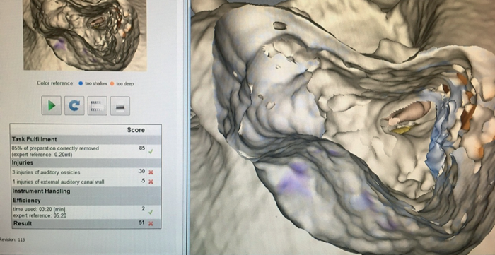 Assessment and feedback on the session is provided by the software which analyses and highlights onscreen, colour-coded areas where drilling was too deep or too shallow and where injuries occurred. The important structures are also colour-coded and the bone overlying these structures has a subtle hue of the colour of the structure to indicate your proximity. At the end, a score is produced, derived from the percentage correctly drilled away, with points deducted for mishandling of instruments, injuries to the dura, sigmoid sinus, ossicles or other important structures, and for the time taken over the expert time. Each session is saved with playback of the activity available for monitoring and review by a trainer.