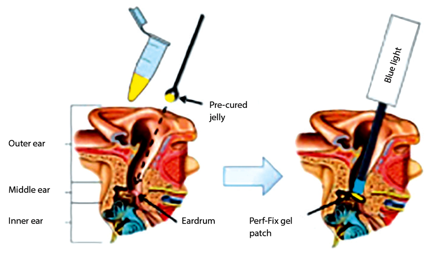 A new innovative biomaterial is in prototype stage which pledges to heal perforation without surgery. It is a light gel patch which acts as scaffold and allows membrane to grow across the perforation. This growing epithelial layer will absorb the gel patch. It is expected not to dislodge from the perforation with the vibration of drum due to its inherent pliability. Tympanogen, Inc.® claims it can be applied in an in-office setting in 10 minutes and does not require freshening of margins [tympanogen.com].