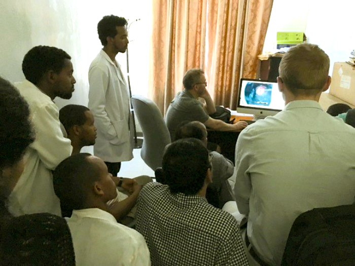 The surgical team gathers for teaching after a long day in the operating theatres in Mekelle.
