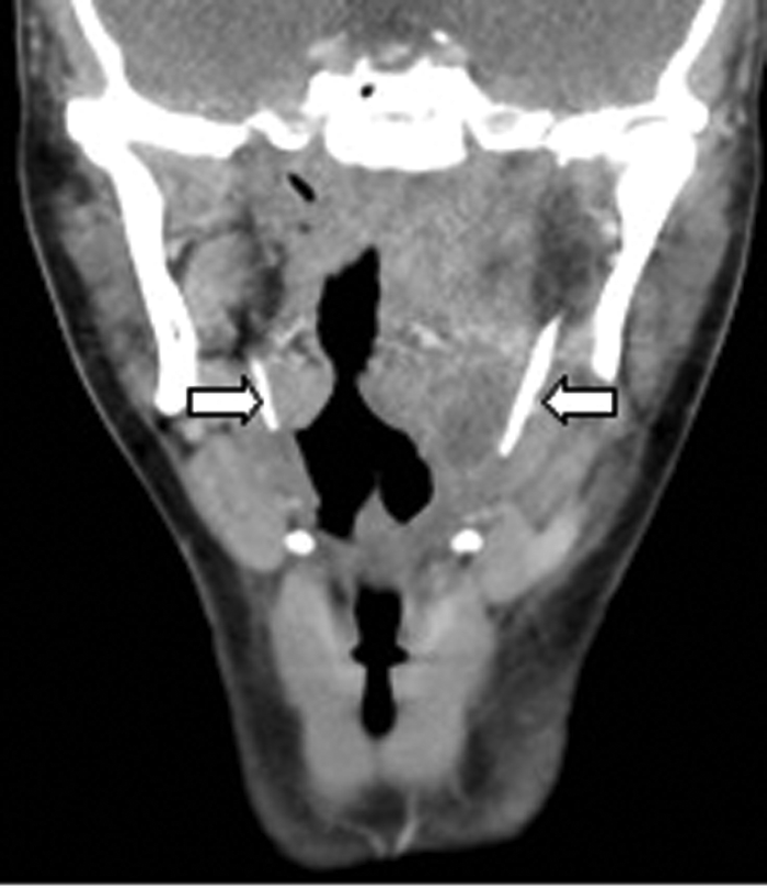 CT (Figure 8) demonstrated a left peritonsillar abscess. In addition Figure 9 shows the patient to have bilateral calcified stylohyoid ligaments. Pharyngitis / tonsillitis are common causes of referred otalgia. Additionally calcification of the stylohyoid ligament greater than 28mm can compress the glossopharyngeal nerve causing dysphagia, tinnitus and otalgia, a collection of symptoms termed as Eagle’s Syndrome.