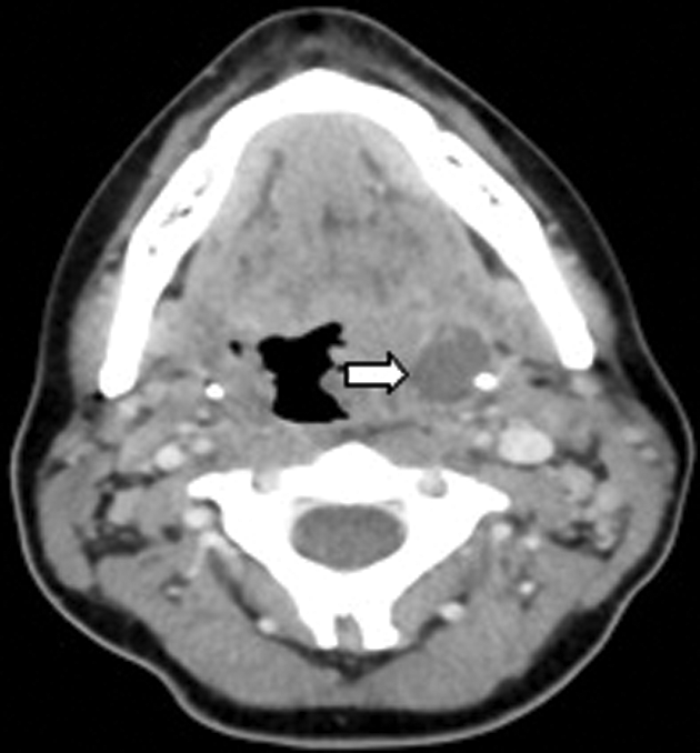 squamous cell carcinoma recurrence within the right pyriform fossa (white arrow).