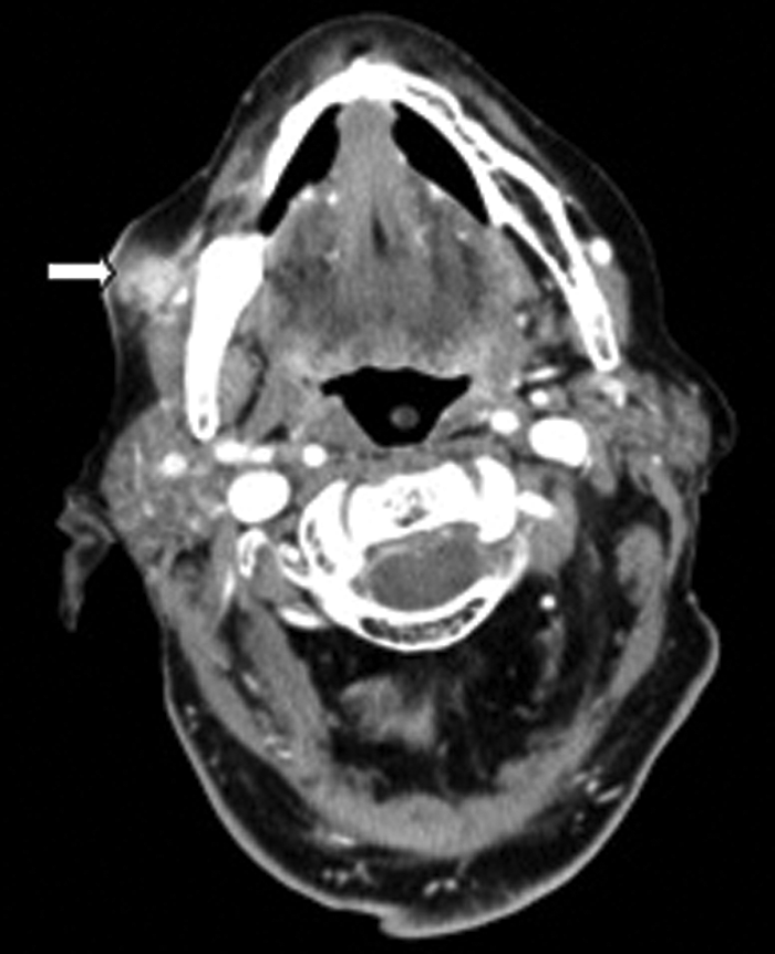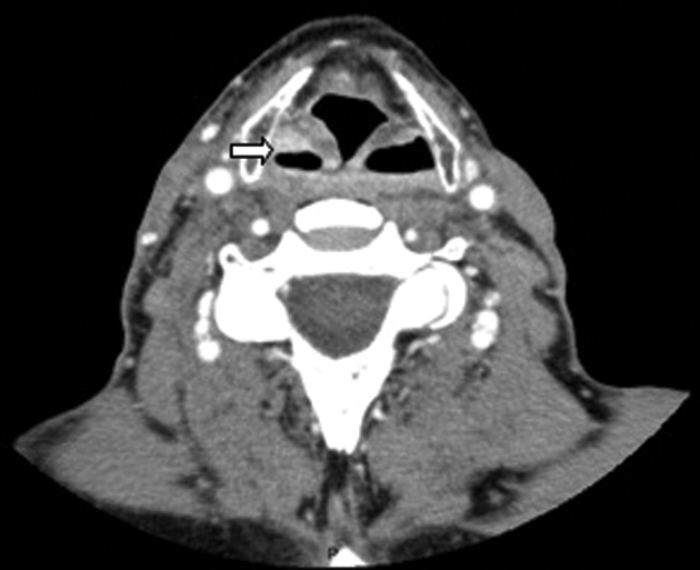 Figure 3: Contrast enhanced soft tissue axial CT demonstrating a buccal space abscess (white arrow).