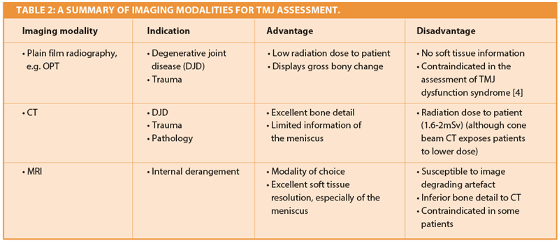 A 45-year-old female presented with a three month history of left otalgia. Otoscopy was normal. On examination there was a palpable click of her left TMJ on opening, with deviation of the mandible to the right. The clinical findings suggested that the patient had internal derangement of the left TMJ (Figure 2).
