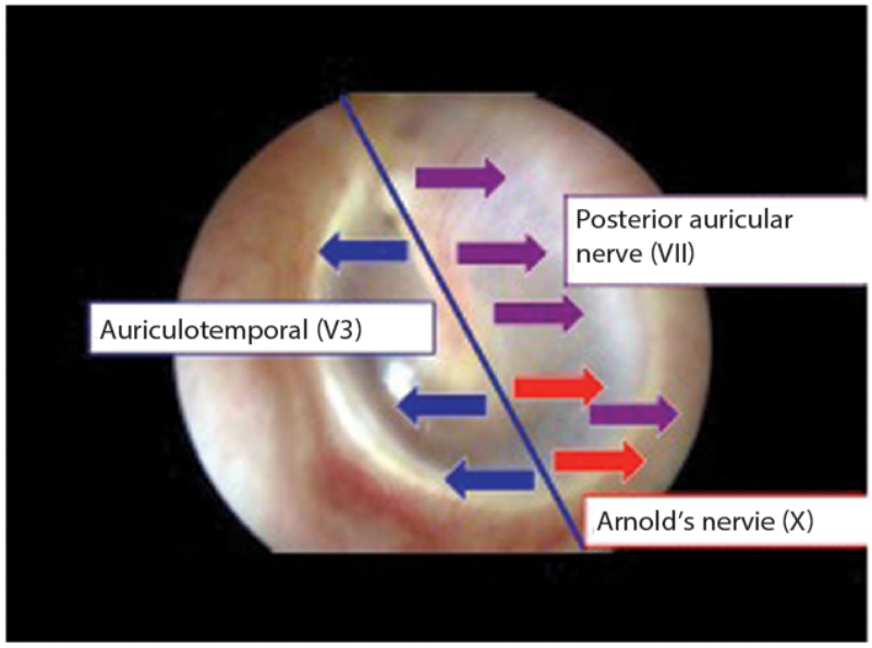 The innervation of the tympanic membrane is complicated. Figure 1 shows a normal tympanic membrane. Using the handle of the malleus as a dividing line, the anterior half of the membrane is innervated by the auriculotemporal nerve, a branch of the trigeminal nerve (the fifth cranial nerve; CNV). The posterior half is supplied by the posterior auricular nerve, a branch of the seventh cranial nerve (CNVII), which is overlapped inferiorly by fibres of Arnolds nerve, from the vagus (tenth cranial nerve; CNX).