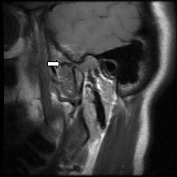 Figure 2: Sagittal T1W MRI of the left TMJ in the open mouth position showing an anteriorly displaced