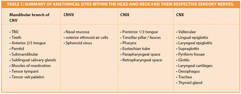 Table 1 is a condensed list of sites within the head and neck innervated by CNV, CNVII, CNIX and CNX. All are potential causes of referred otalgia.