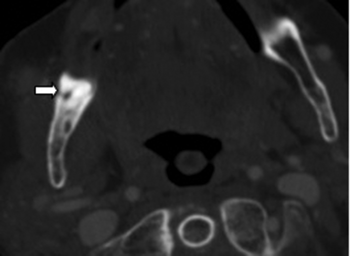 Figure 4: Bone window axial CT demonstrating a retained root (white arrow).