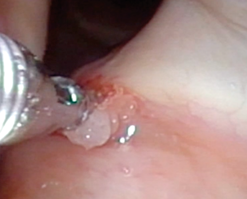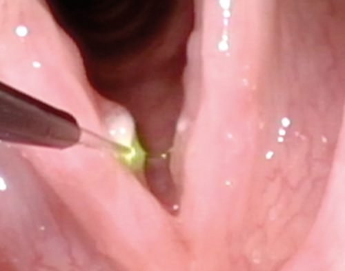 Figure 4. Intralesional injection (here: cidofovir) after laser treatment. Note that endoscope is rotated for easier access to anterior commissure.