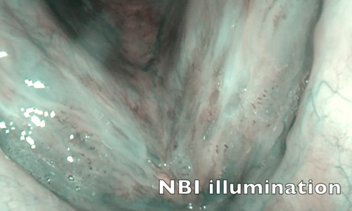 Figure 1. In-office transnasal dipping manoeuvre for high magnification of RRP. NBI is used to better detect RRP vessel patterns.