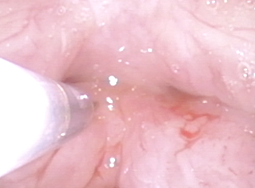 Figure 3. Photoangiolytic laser treatment (445nm blue laser with 400µm glass fibre) routed through instrument channel.
