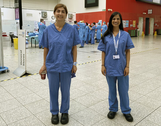 Zena Butt and Aarti Makan posing in itchy scrubs.