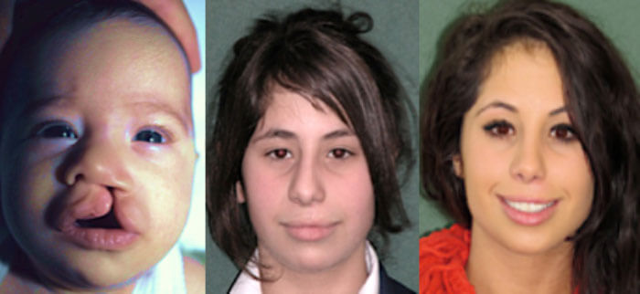 Figure 6. A young girl with a unilateral cleft lip and palate prior to repair; then at age 13 after bone grafting of her cleft alveolus - no further lip or nose surgery has been performed since her original cleft repair. Nasal growth has been relatively normal except for some remaining septal deviation toward the cleft side; finally, the same girl at age 20 after maxillary repositioning, orthodontia and an open nasal correction.