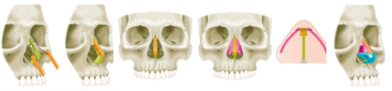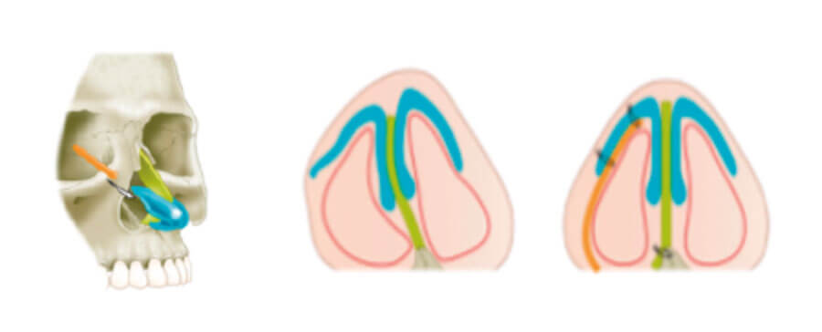 Firstly, straighten and reinforce the dorsal septum with septal or costal cartilage grafts. Connect the ULCs with extended spreader grafts to complete a strong laminated beam construct that prevents warping (see Figure 4). The angle of attachment of the ULCs can be fixed in such a way as to maintain the internal valves. Reinforce the caudal septum if required. Connect the LLCs securely to the septal beam.