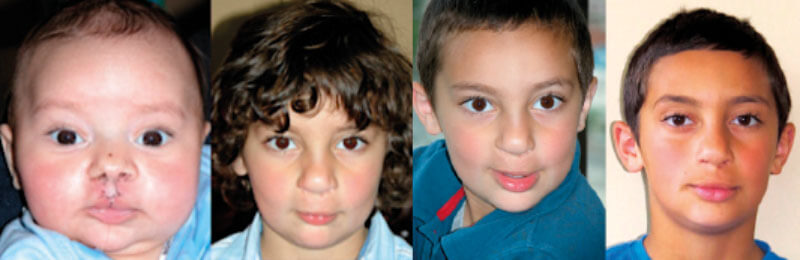 Figure 3. The same child at postoperative day six, just prior to suture removal; then at age two, four and eight years.