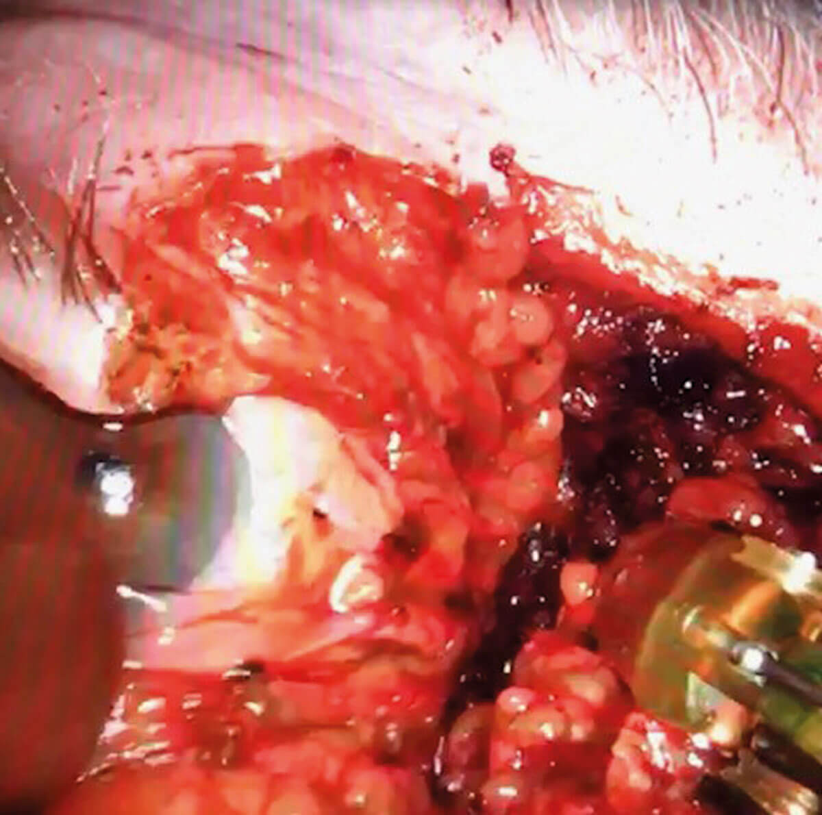 We used the da Vinci Xi system to clear the tumour whilst preserving the orbit. The procedure was performed with the Xi system. A wide local excision was performed using the robot, a skin incision was made, the medial canthal ligament was divided and dissection was taken down to the medial orbital wall with exposure of the lacrimal crest. An en-bloc resection of the specimen was performed. During the surgery we did not detect any arm clashing or any orbital trauma as a result of the robotic arms. The patient made an uneventful recovery and was discharged on the next postoperative day. We understand that this is the first time that the da Vinci robotic system has been applied for orbital malignancy surgery.