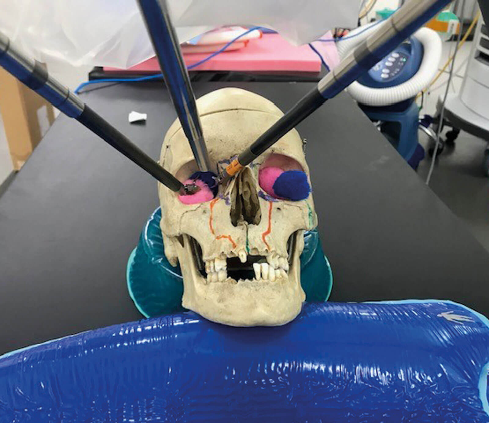 Guy’s & St Thomas’ Hospital has one the largest robotic programmes in the UK, utilising seven robots across several different surgical specialties. This project also collaborates with the surgical and interventional engineering department of King’s College London. The purpose of this research project is to develop the feasibility of robotic assisted orbital surgery (RAOS) in clinical practice and develop an optimised surgical configuration. The initial dry lab experiments involved a skull, and we deployed the da Vinci XI system (Intuitive Surgical, California, USA) in order to see if robotic surgery could be carried out successfully around the orbit. We optimised the setup and instrument orientation and determined feasibility of the project (Figures 1 and 2). The next step involved a series of wet lab cadaveric dissections in which we then utilised the Versius (CMR Surgical, Cambridge, UK), a next-generation CE marked robotic surgical system, in order to further determine feasibility and understand the possibility of application to periorbital surgery [2].