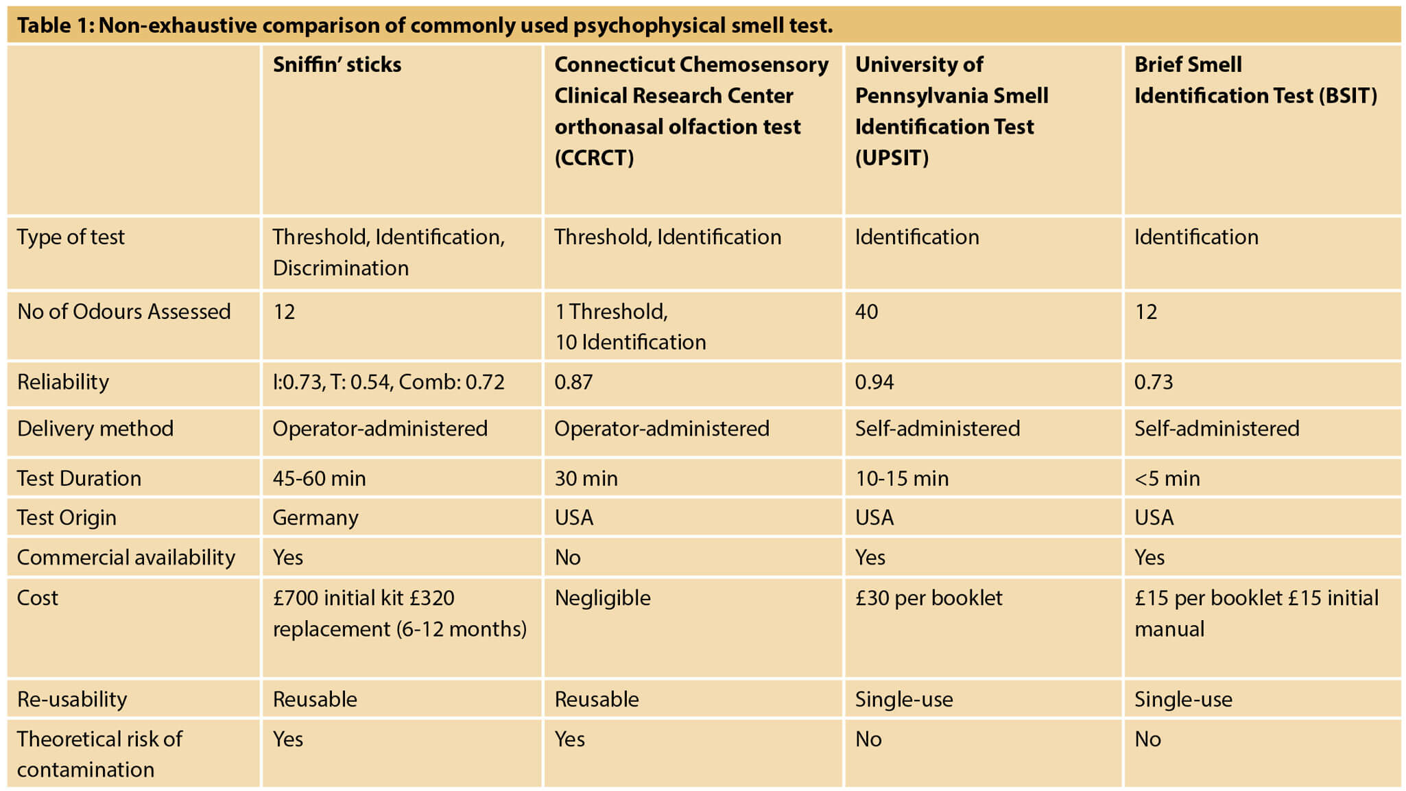 Several smell tests exist (Table 1). The Sniffin’ Sticks dispense odours through pen-like devices and assess threshold, identification and discrimination, and are validated for use in the UK. The Connecticut Chemosensory Clinical Research Center (CCCRC) uses bottled fragrances and assesses threshold and identification. This test is not commercially available and is usually devised by the hospital lab for clinical use, making it an inexpensive option. The reusable testing does have limitations, including its considerable testing time, the need for personnel resources and the potential risk of microbial contamination, due to the close proximity of pen tip or bottled fragrances to the nose or lips. One precautionary measure is mandatory pre-clinic COVID test and self-isolation three days prior to the clinic attendance, similar to preoperative measures. In order to avoid contact of Sniffin’Sticks, the German Society for Otolaryngology recommends using single-use cellulose paper strips, appropriate for identification and discrimination tests.