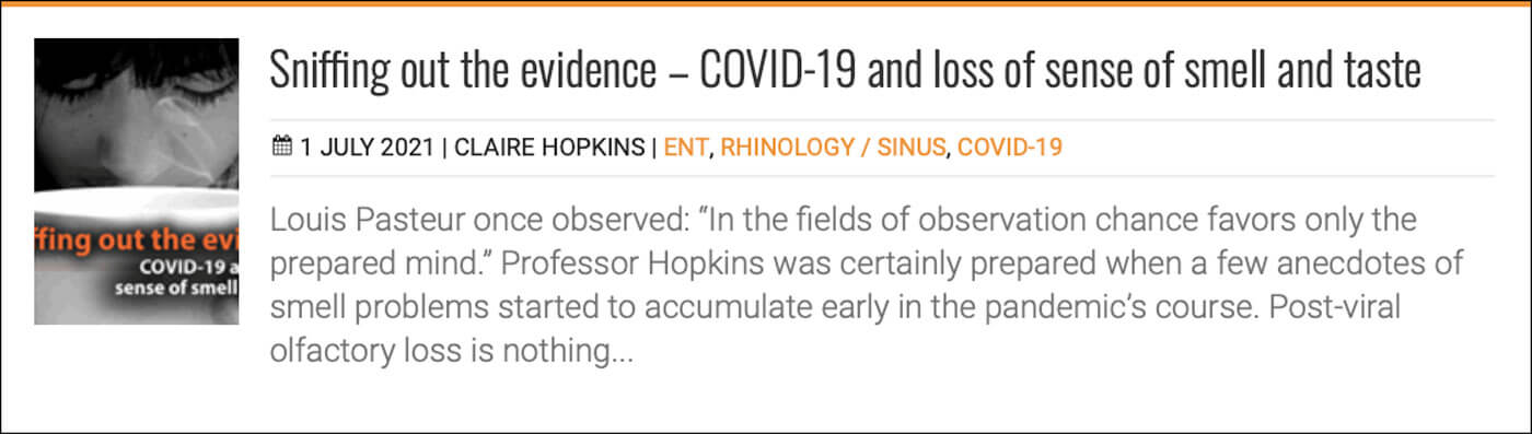 Over the past year, much of our effort as a speciality has been directed towards crisis management and keeping services afloat. Our practice has changed in untold ways, but unprecedented numbers of patients with smell disorders will increasingly require our attention, so here’s Wahidah Wahid and Lisha McClelland with some invaluable suggestions on how to forge a smooth clinical pathway.