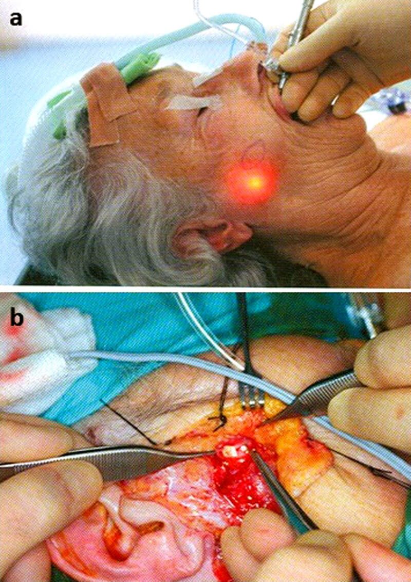of the sialendoscope; (b) and removal of the stone via an external parotidectomy approach.