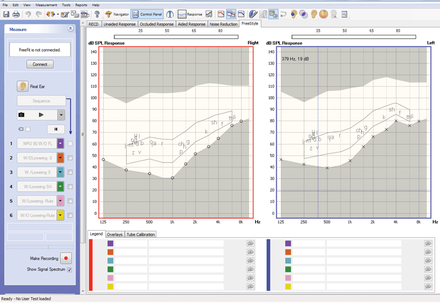 FreeStyle offers you a number of flexible features that allow you to create your own tests for demonstrating and verifying hearing instruments, features and fitting. FreeStyle enables you to make measurements using a variety of different sound sources. It allows for two signals to be played simultaneously, either from a front speaker and a rear speaker, or from a single speaker. Two measurements can be made which then allows for a view of a curve that illustrates the difference between the two measurements.