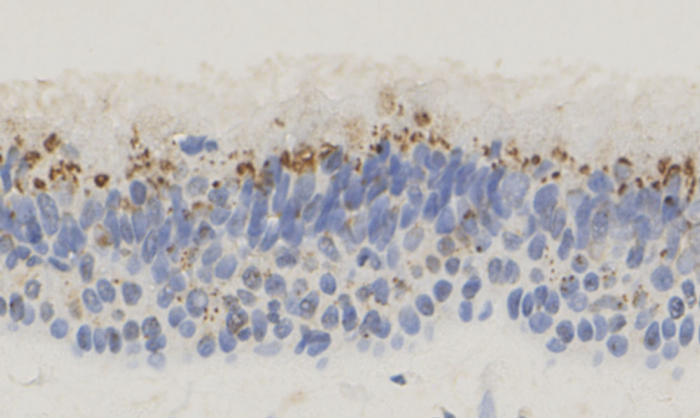Figure 1. Photomicrograph taken at 40x magnification, demonstrating the intracellular localisation of S. aureus (brown staining) within the respiratory epithelium of patients with CRS. Immunohistochemistry using mouse anti-S. aureus antibody was performed to identify the intracellular bacteria. Image courtesy of Dr Judy Ou, Department of Otolaryngology, The University of Adelaide, Australia.