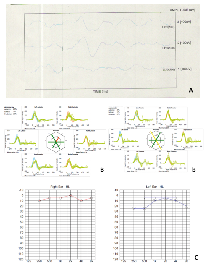 Figure 2. cVEMPS recorded at a level of 70dB (A), six-canal vHIT (B and b) and pure-tone audiogram showing low frequency air-bone gap (C) in patients with SSCD. Of note, the six-canal vHIT can show abnormal responses from not necessarily the superior semicircular canal. In the cases here we show reduced gain (B) in the right superior semicircular canal (patient with right SSCD) and increased gain in the left superior and right posterior semicircular canals (patient with left SSCD), possibly as result of the vestibular integration process.