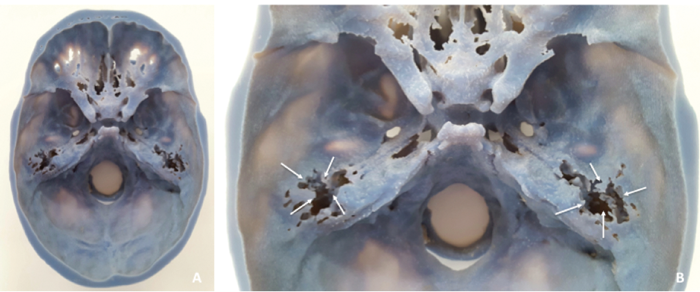 Figure 3. 3D-print of the skull of a patient with bilateral SSCD; of note the multiple tegmen bony defects (white arrows).