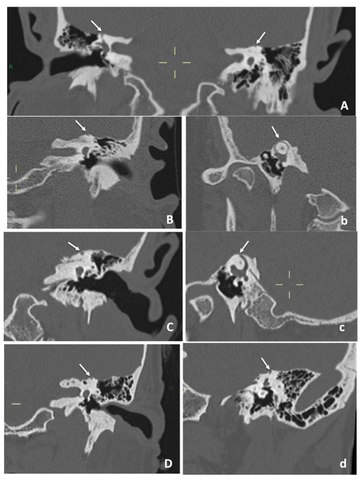 Figure 1. CT scans of a few of the patients with SSCD showing coronal (A, B, C and D) and sagittal and parasagittal oblique (b, c and d) sections of the temporal bone. The dehiscence is marked with white arrows and its extent can vary; in A the defect is bilateral.