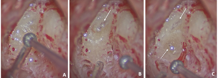 Figure 5. The anterior aspect of the superior semicircular canal is gradually ‘blue lined’ (A) until the endosteum is visibl e- white arrow (B); the same process is followed for the posterior aspect of the superior canal-dashed arrow (C).