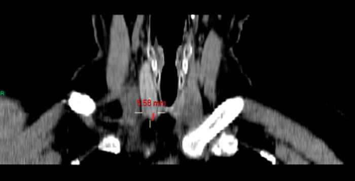 Figure 4. Coronal CT image to show measurement from posterior inferior edge of thyroid gland to PT gland (5.58mm).