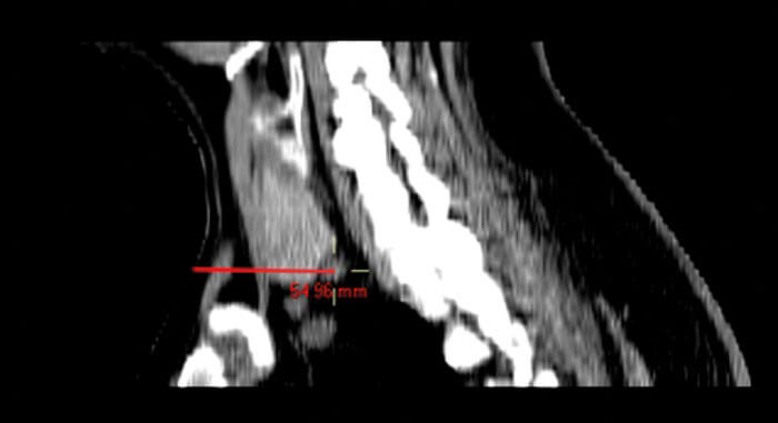 Figure 5. Sagittal CT image showing distance from skin to PT gland (54.96mm), also confirms distance between inferior edge of thyroid gland to PT gland.