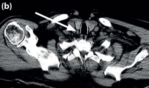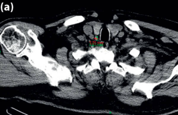 Figure 2 (a) Axial CT scan showing PT gland measurements 5.85mm x 8.83mm; (b) arrow points to PT gland.