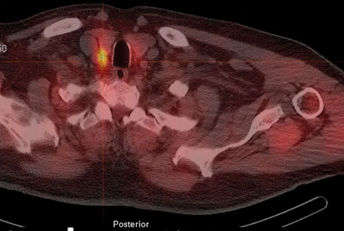 Figure 1. Spect CT scan in axial plane showing position of the parathyroid adenoma highlighted.