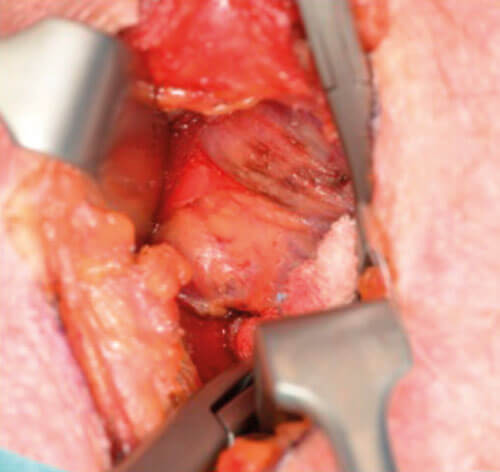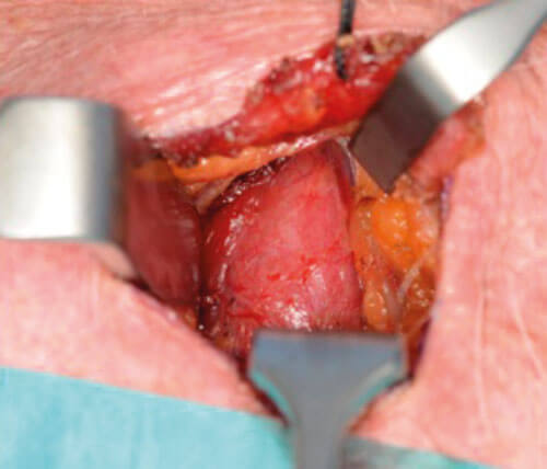 Figure 8 and 9. Minimal dissection required. Retraction of thyroid lobe to locate PT gland.