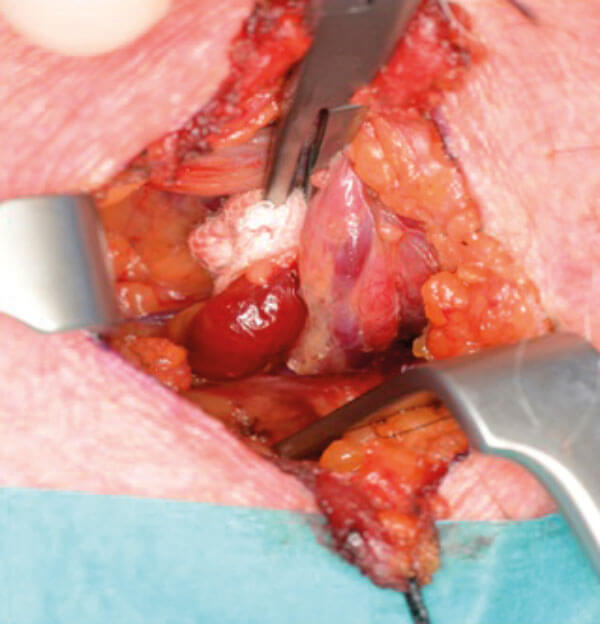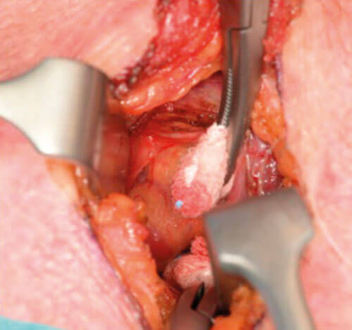 When the dissection has progressed to the stage of identifying the surface of the thyroid gland, the ruler can be used to measure the distance from posterior aspect of thyroid to where the targeted PT gland should be. Confirmation of cricoid distance may be used at this time to accurately pinpoint the adenoma. This is useful when starting to do this type of surgery.